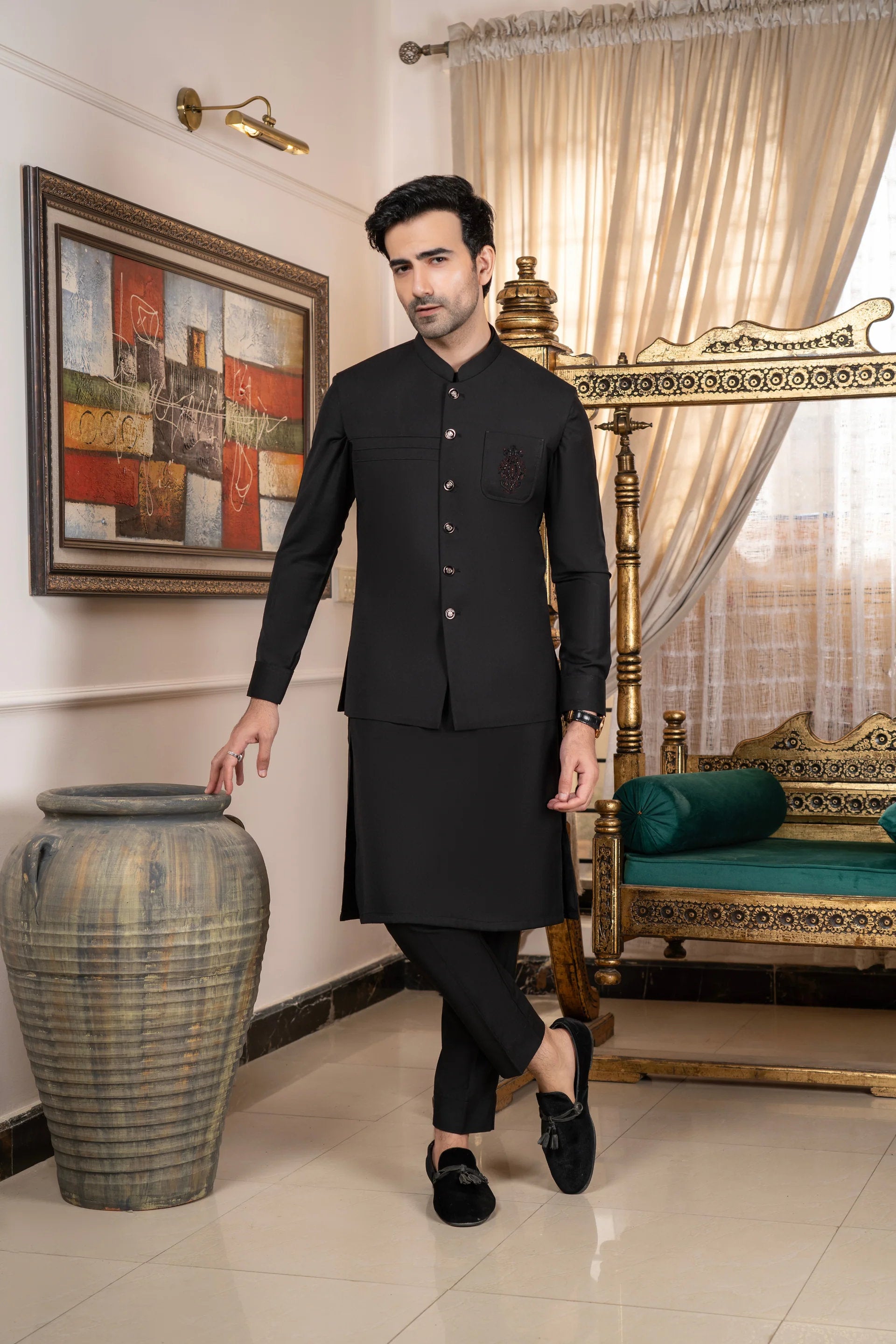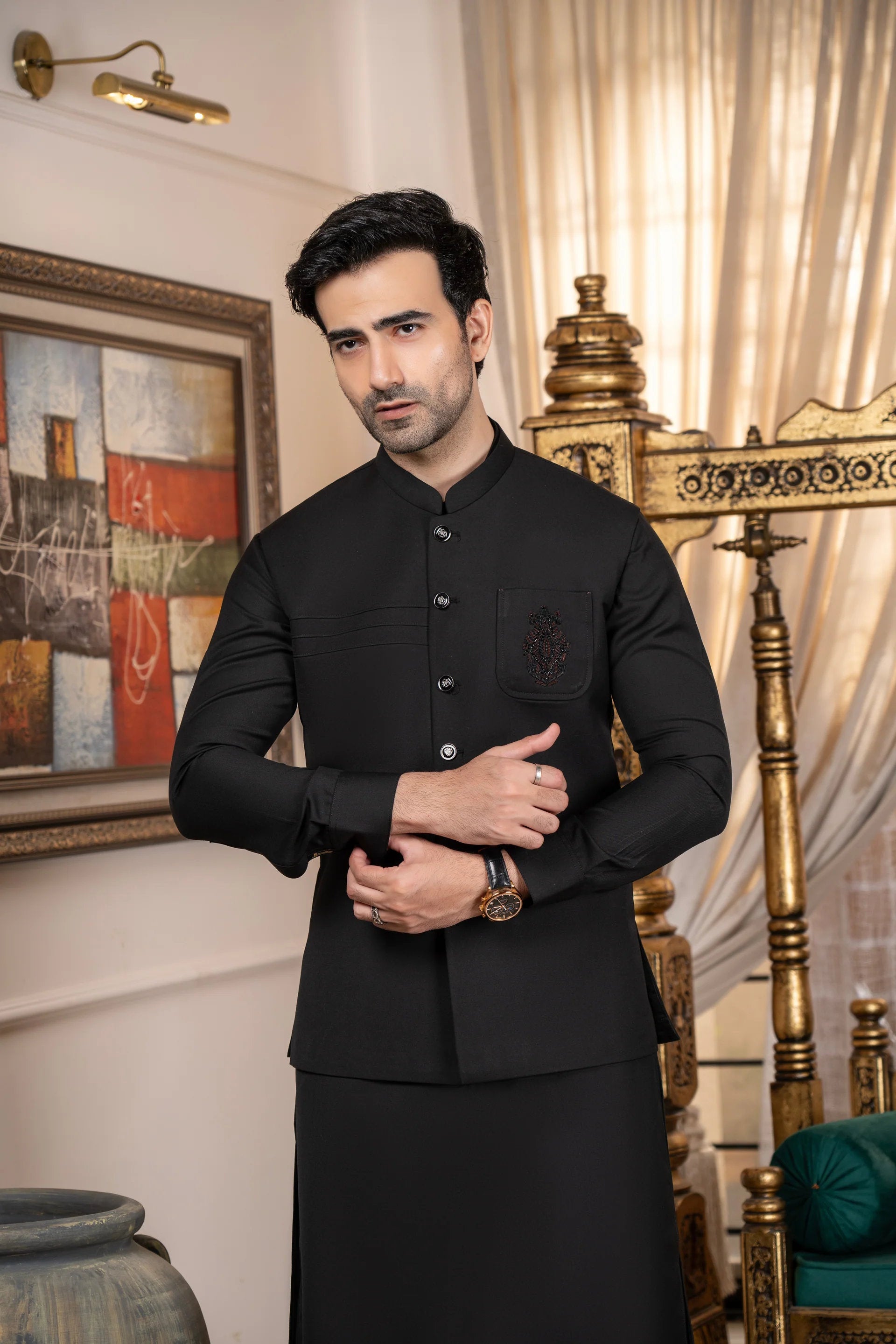 Step into refined sophistication with Rasm O Riwaj Design #11. The set combines a beautifully embroidered waistcoat with a simple yet premium wash & wear suit fabric for a balanced and elegant look.